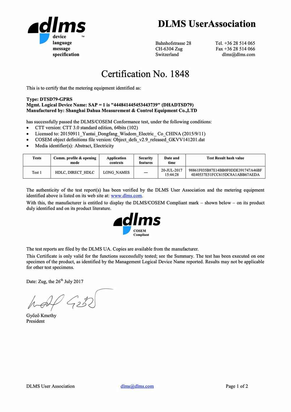 计量器具型式批准证书-单项费控智能电能表;